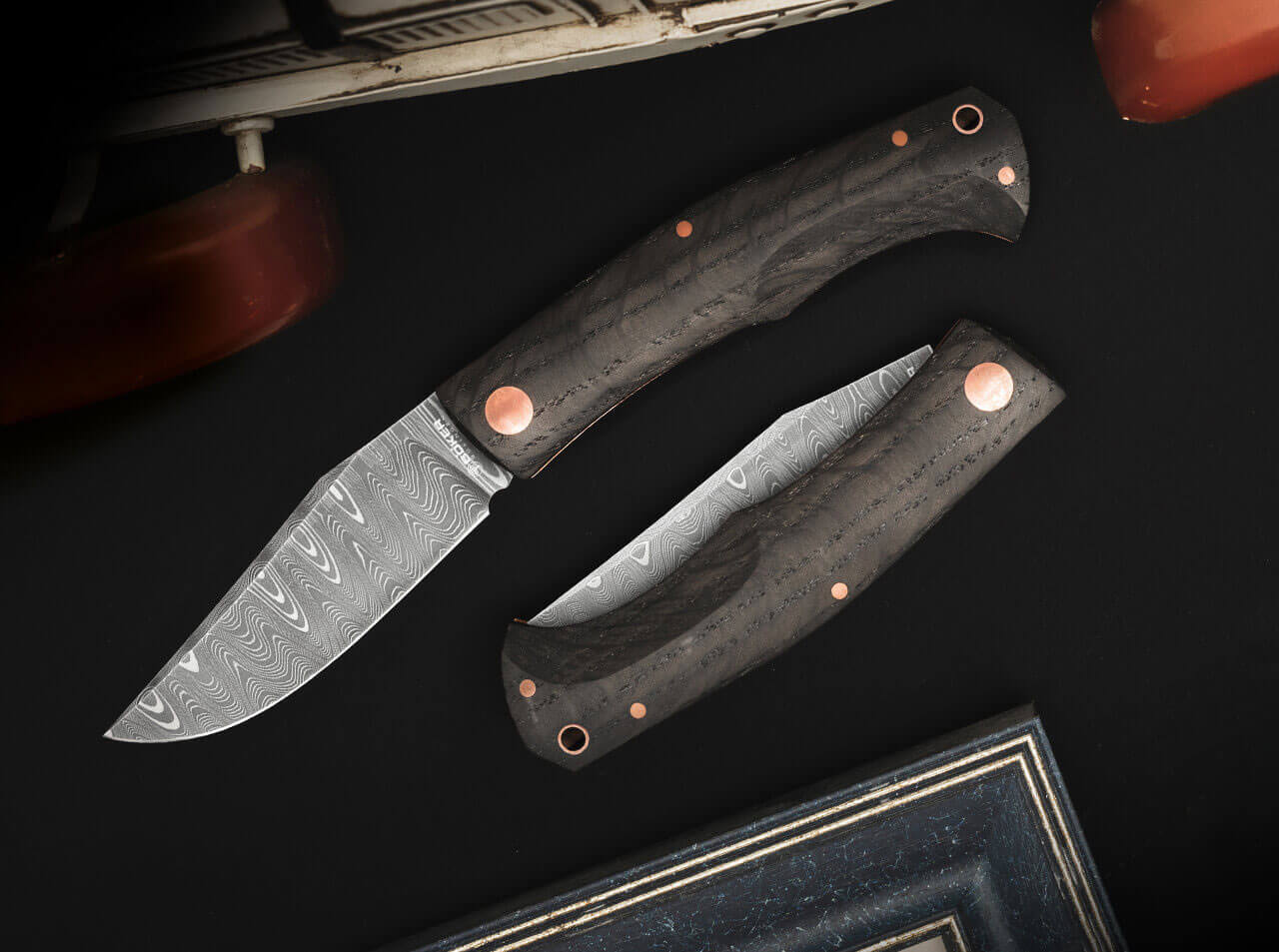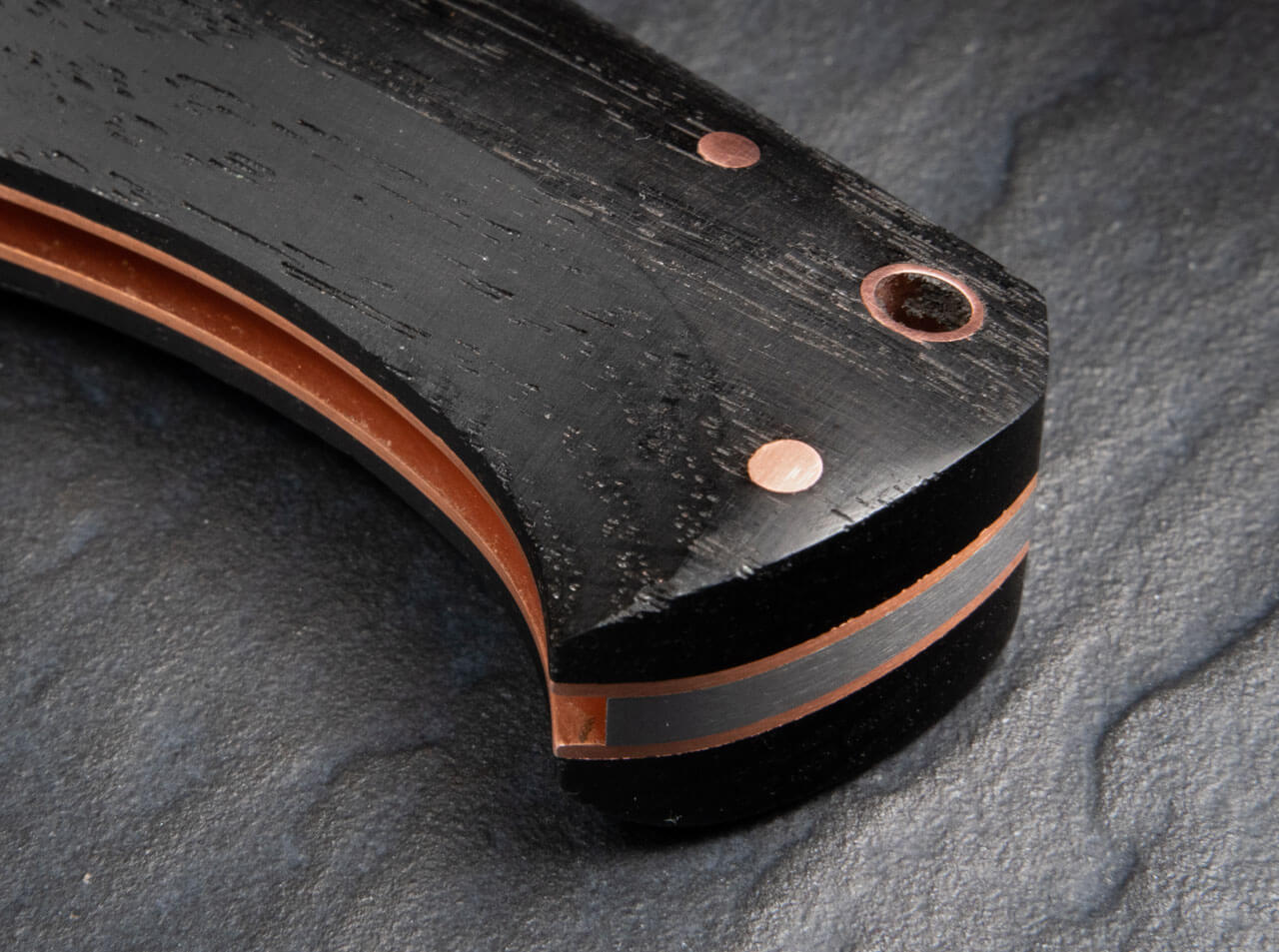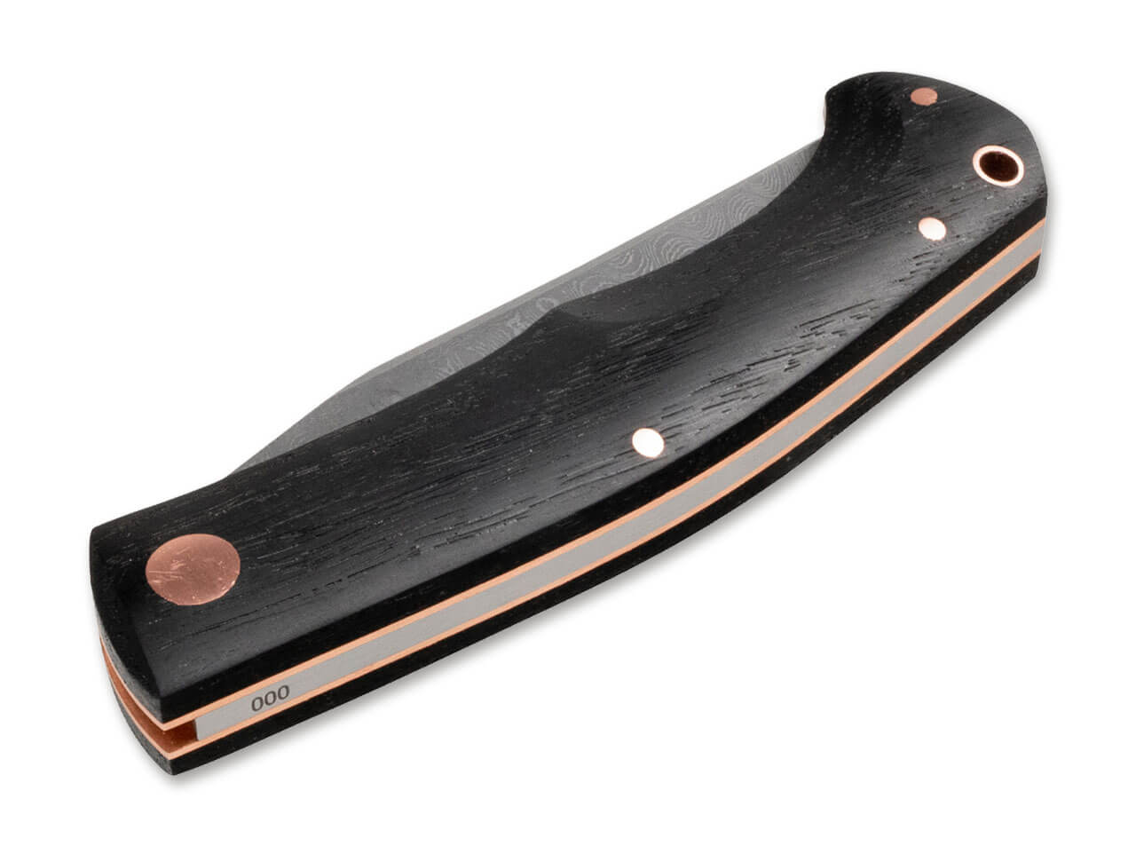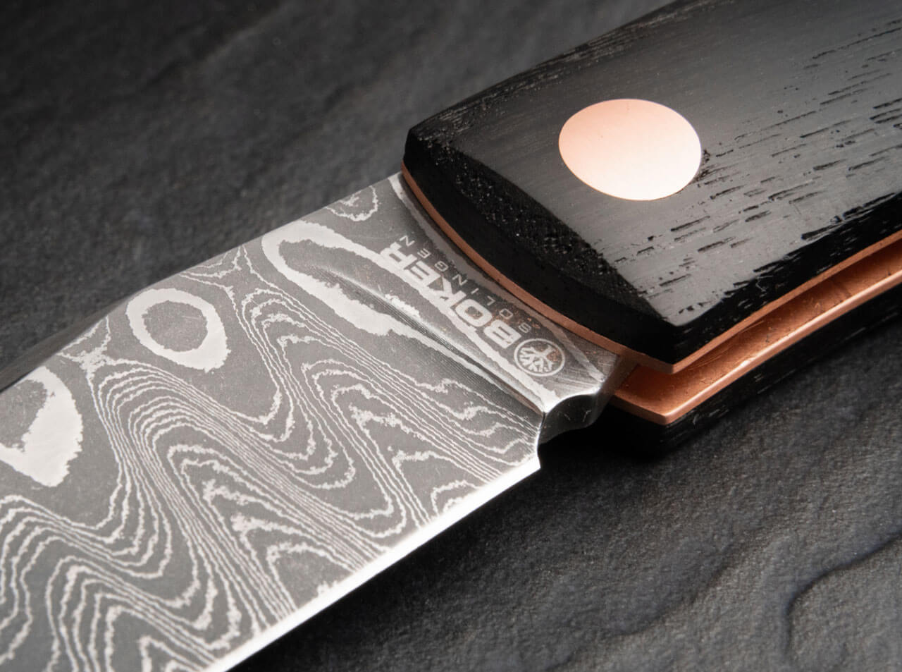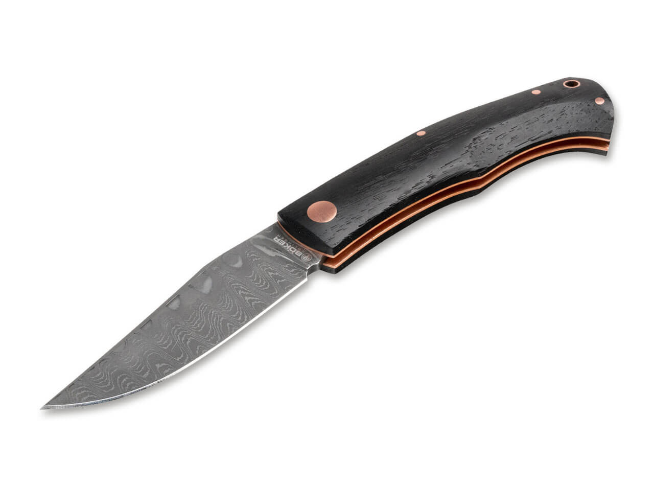 The decorative copper rivets form a colorful contrast to the dark handle scales, which is further emphasised by the liners also made of copper. The practical lanyard hole is also reinforced with a copper bushing. Handmade in the Boker Knife Manufactory in Solingen and strictly limited to 999 pieces worldwide. Supplied with a noble floating display, a certificate of authenticity and an individual serial number.
