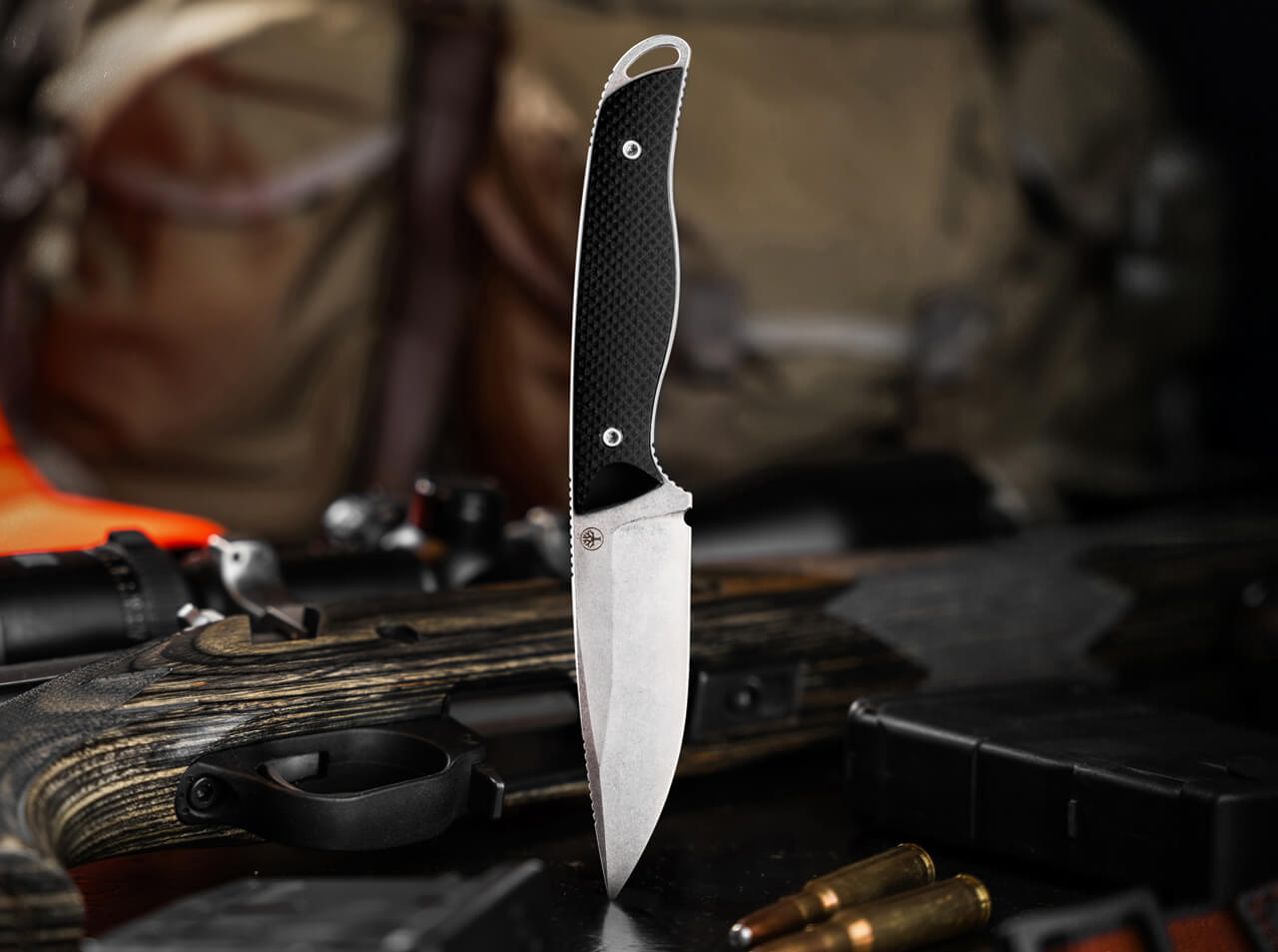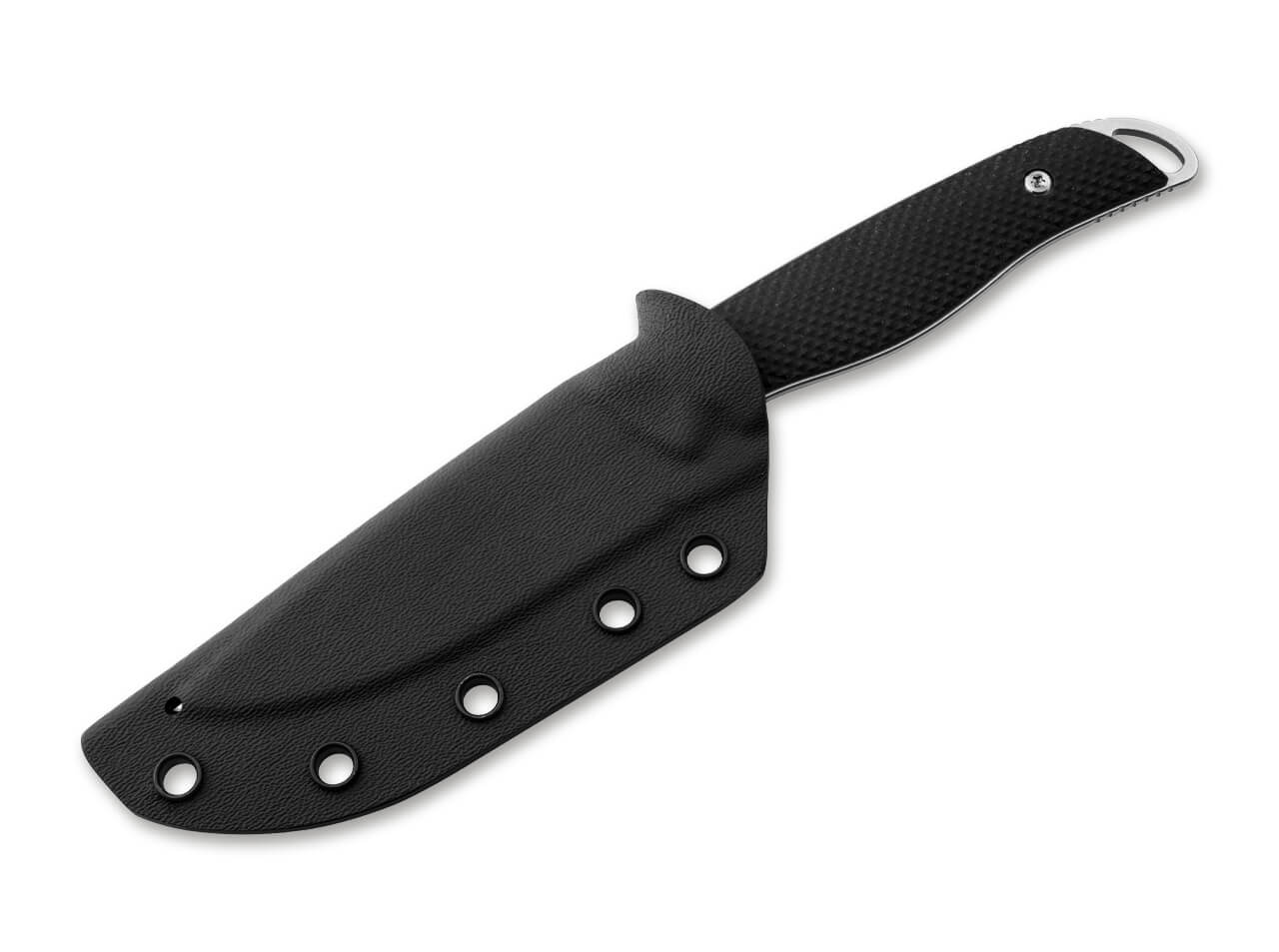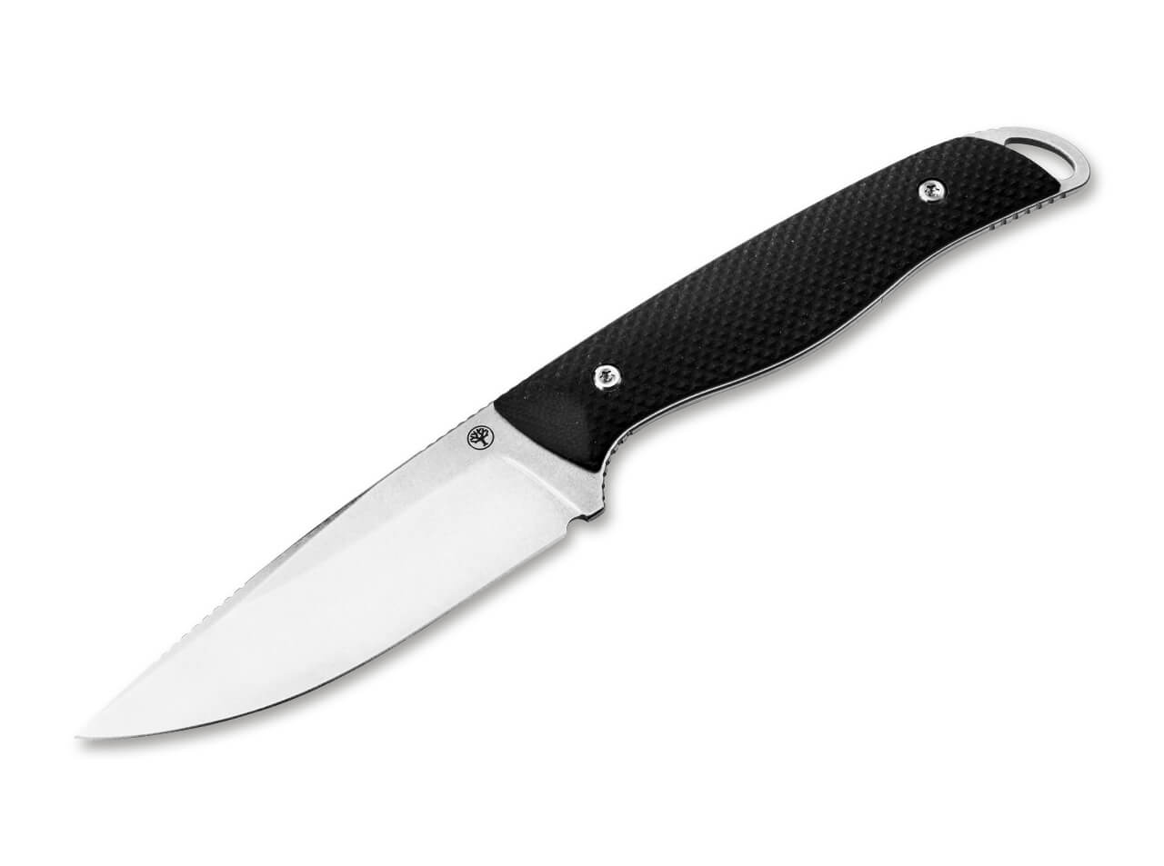 The textured black G10 handle ensures a secure grip — even in rain, cold, or sweaty conditions. The full-tang construction provides reliable strength transfer with minimal weight, creating a versatile outdoor knife ideal for hunting, bushcraft, trekking, survival, and everyday cutting tasks.