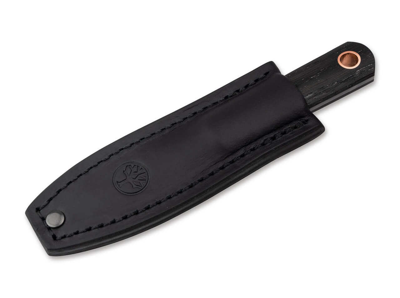 The Damascus blade with 150 layers develops an irresistible and archaic appeal in combination with the scales made of up to 5,000-year-old bog oak. The decorative hollow copper stud also serves as a catch strap eyelet and, together with the studs of the same colour, adds a visual accent. Supplied with a precisely fitting black leather sheath, which ensures a high level of carrying comfort with the help of the integrated clip. Handmade in the Boker Knife Manufactory in Solingen.