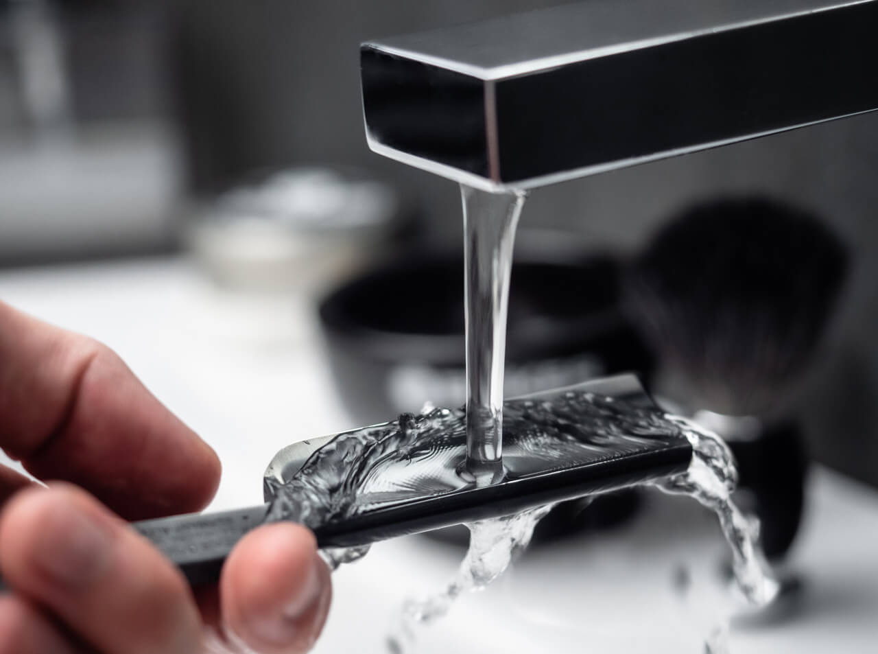 The hilt made of exotic Amboina wood impresses with its strikingly variegated grain, which in parts is reminiscent of wild carbon fibre. The wood, which originates from Southeast Asia, owes this special structure to its tuber-like intergrowths in the area of the roots, which gives each knife its unique character. The distinctive black and the pleasantly smooth surface of the handle are achieved with the help of stabilising the wood. In this special process, heated epoxy resin is pressed into the wood pores and then hardened. The bulbous shape of the handle forms a successful contrast to the straight edge of the blade, expressively emphasising the lines of the razor.