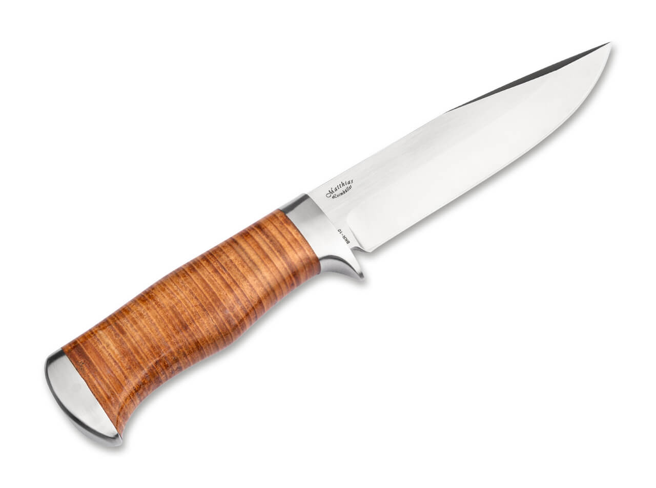 The fixed drop-point blade features an elegant satin finish and is crafted from Boker’s exclusive BKR-10 steel. This powder-metallurgical alloy delivers an exceptional balance of elements, resulting in a rust-resistant steel with outstanding corrosion resistance and high hardness. Its elevated carbon and chromium content, enhanced by cobalt, ensures long-lasting durability and cutting performance. Carving, slicing, and cutting tasks are executed with confidence thanks to the integrated guard with finger protection, the ergonomically shaped, slip-resistant leather handle, and the harmoniously contoured pommel.