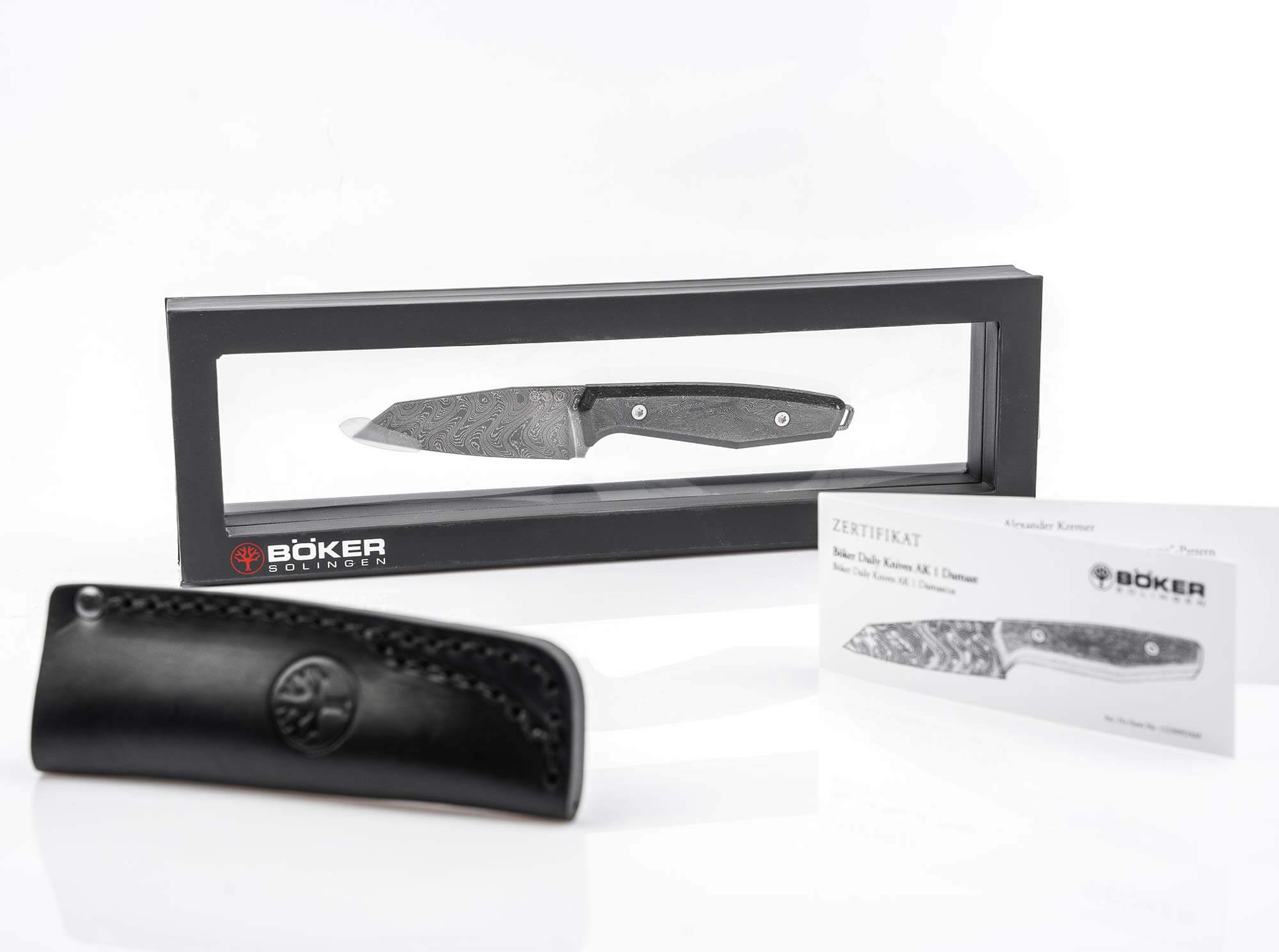 The handle scales can be removed effortlessly with the included Torx key, so that the elaborately crafted lanyard hole at the end of the handle can be turned around when the handle scales are removed and optionally disappear into the handle. Supplied with a high-quality black leather sheath, which has a sewn-in Ulticlip and can be conveniently attached to the hem of the pocket thanks to the locking spring clip. This allows the Boker AK1 Damascus to be drawn effortlessly while the sheath is reliably held in place by the Ulticlip. Handmade in the Boker Knife Manufactory in Solingen.