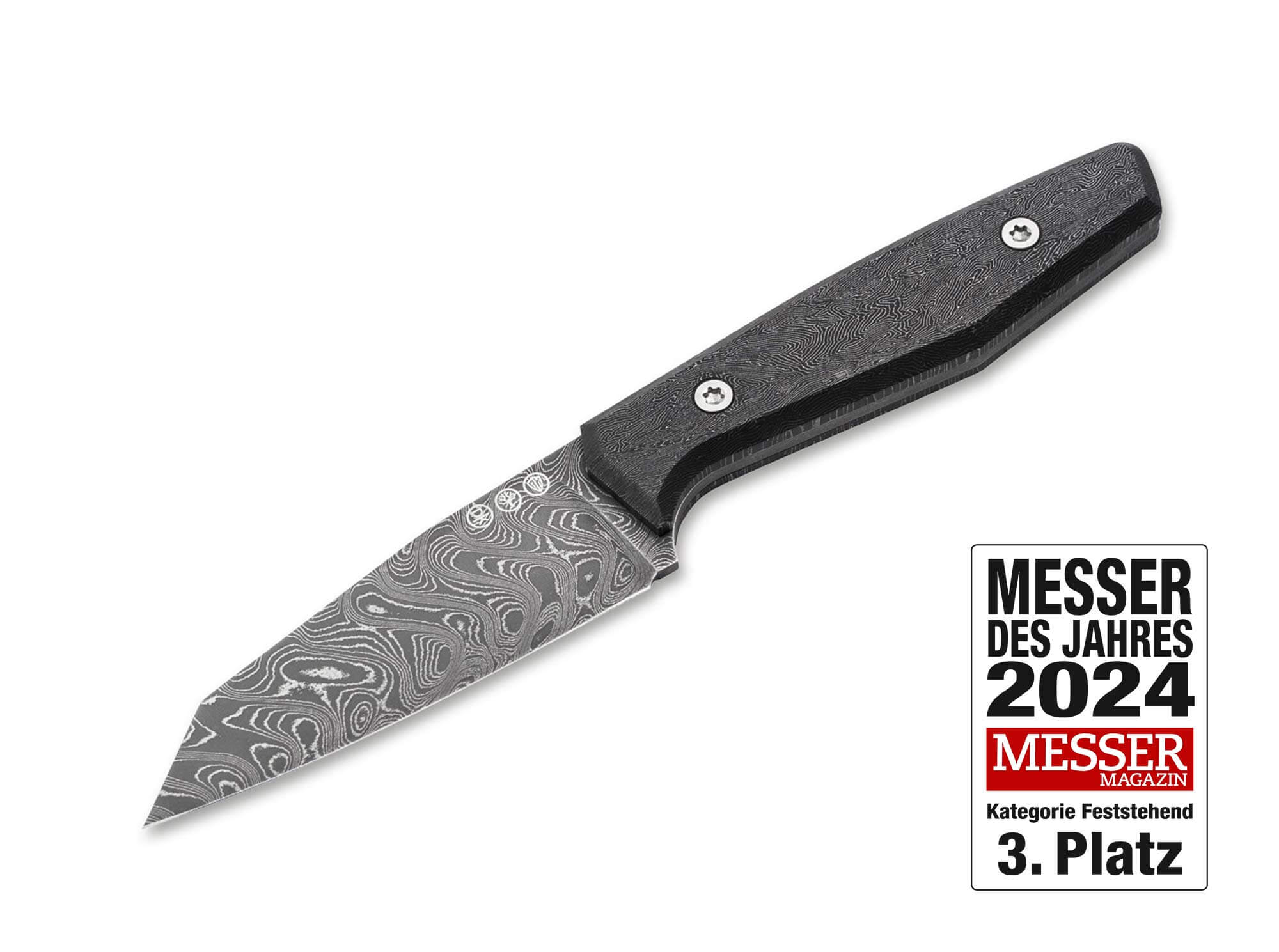 This material highlight was considered just good enough for us to use it as handle scales for the blade and tang made of stainless Damascus by Chad Nichols in the Boomerang pattern. This creates a charming visual interplay between the materials, which also both have the best mechanical properties in their respective functions.