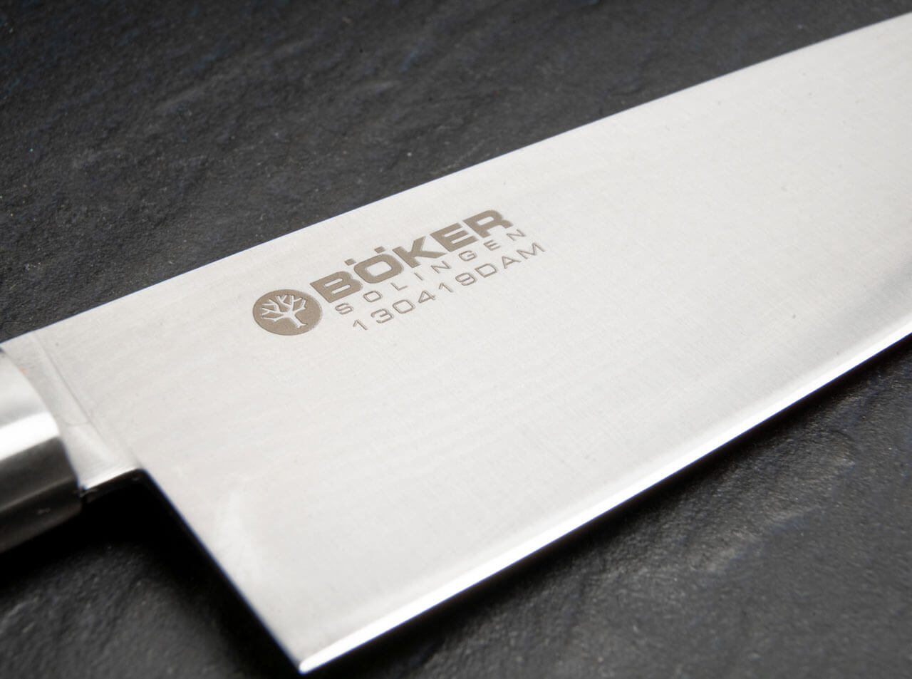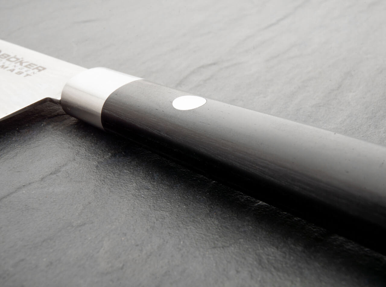 The secret of this unusual sharpness lies in the material and its processing. The blade consists of 37 layers of Damascus steel. The stainless premium blade steel VG-10 used for the center layer is made in Japan and offers hardness, resilience and a homogeneous crystalline structure. In direct cooking performance comparison with a product made by an established Solingen kitchen knife manufacturer in accordance with DIN EN ISO 8442-5, the kitchen knife line Boker Damascus Black is literally a cut above. The representative DIN test showed that the cutting performance of our knives was 68% better than that of the competitor's product. The knives also score points with their higher level of initial sharpness. Thus, constant sharpening is a thing of the past.
