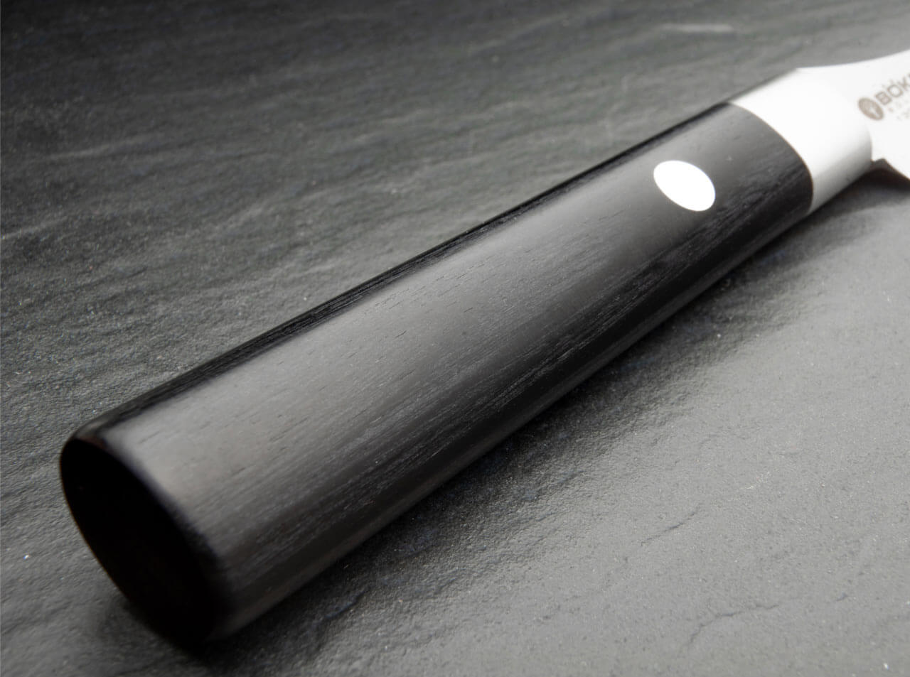 The secret of this unusual sharpness lies in the material and its processing. The blade consists of 37 layers of Damascus steel. The stainless premium blade steel VG-10 used for the center layer is made in Japan and offers hardness, resilience and a homogeneous crystalline structure. In direct cooking performance comparison with a product made by an established Solingen kitchen knife manufacturer in accordance with DIN EN ISO 8442-5, the kitchen knife line Boker Damascus Black is literally a cut above. The representative DIN test showed that the cutting performance of our knives was 68% better than that of the competitor's product. The knives also score points with their higher level of initial sharpness. Thus, constant sharpening is a thing of the past.