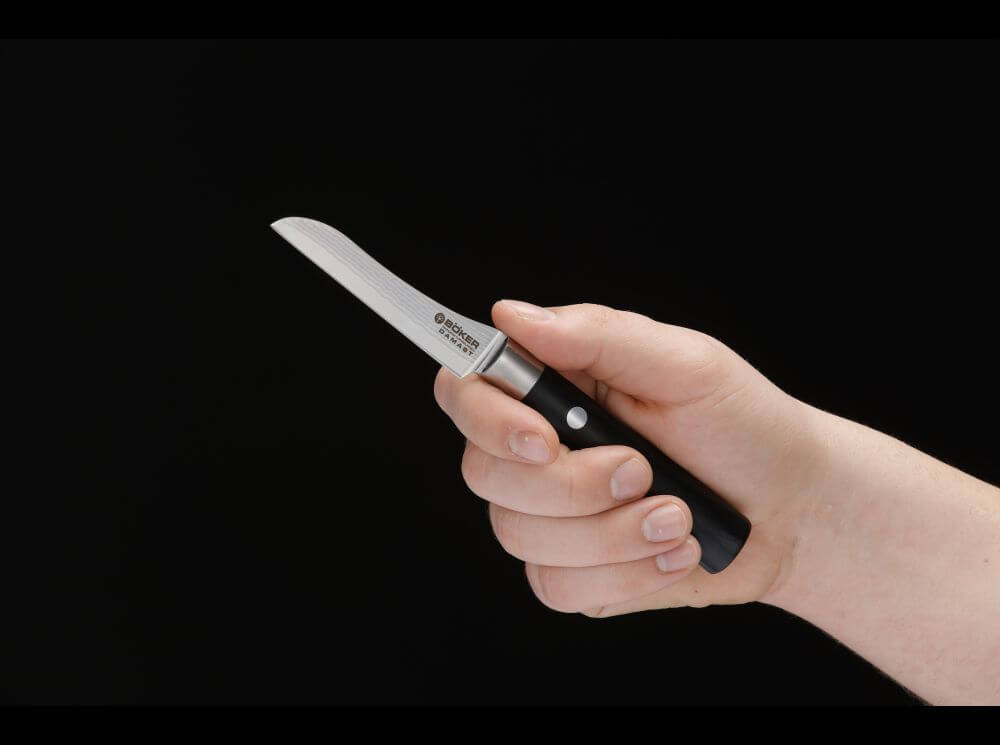 The Boker Damascus Black Kitchen Knife line combines traditionally Japanese handles made of black Plywood with razor-sharp blades made of stainless Damascus with 37 layers of steel, characterized by a beautiful grain. The extremely high-impact core of the Damascus blade consists of the high-performance VG-10 steel. The noticeable sharpness when cutting is breathtaking and makes cooking an experience. The Japanese design of the knife handle with the matted stainless steel clamps gives the line its special character.