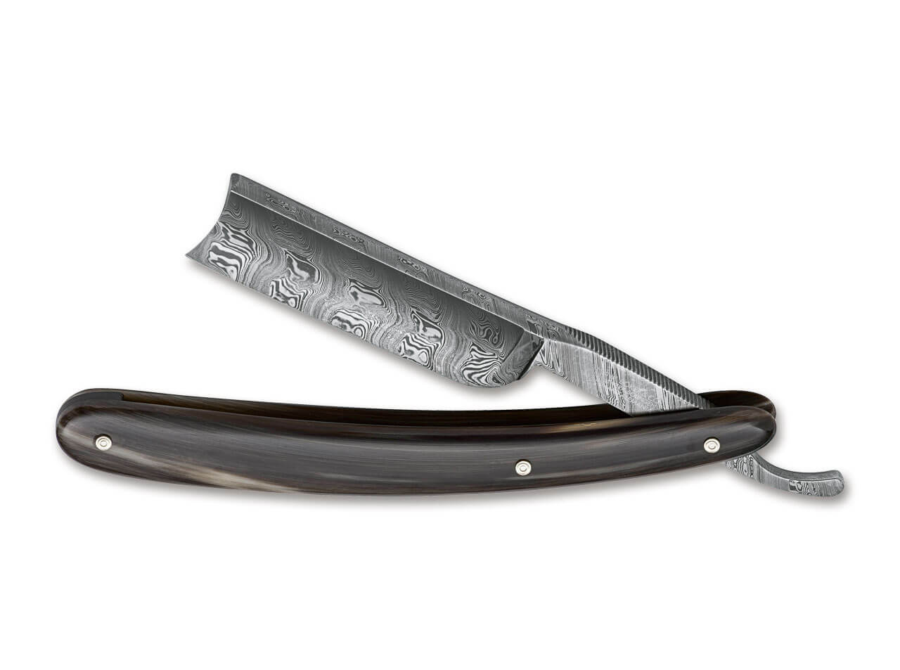 Hand-picked horn handles and a noble 6/8 inch blade made of stainless damascus make the Boker Damascus Horn a unique one-of-a-kind. The absolutely high-quality appearance of the horn handle is further emphasised by the use of a third rivet. Due to its distinctive front cutting end, the Spanish head is particularly suitable for particularly precise shaving and the exact processing of the beard contour. The blade is ground extra hollow with ridge. With authentic Boker laser engraving in the blade passage, certificate of authenticity and historical packaging. Handmade in the Boker knife manufactory Solingen.