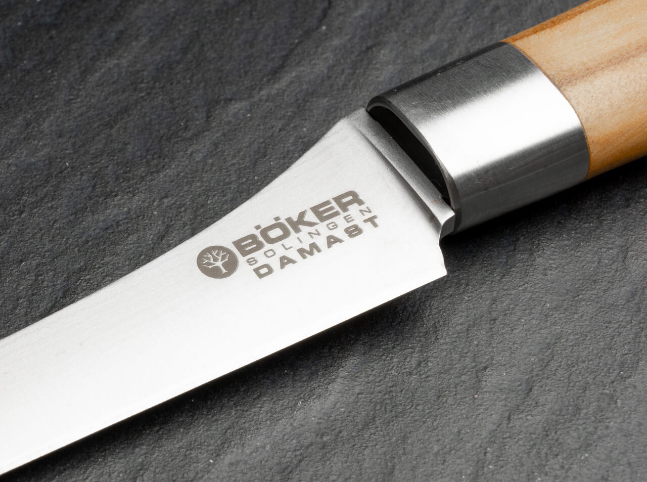 The secret of this unusual sharpness lies in the material and its processing. The blade consists of 37 layers of Damascus steel. The stainless premium blade steel VG-10 used for the center layer is made in Japan and offers hardness, resilience and a homogeneous crystalline structure. In direct cooking performance comparison with a product made by an established Solingen kitchen knife manufacturer in accordance with DIN EN ISO 8442-5, the kitchen knife line Boker Damascus Olive is literally a cut above. The representative DIN test showed that the cutting performance of our knives was 68% better than that of the competitor's product. The knives also score points with their higher level of initial sharpness. Thus, constant sharpening is a thing of the past.
