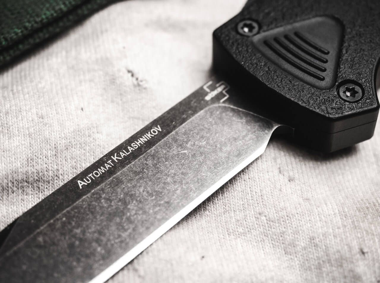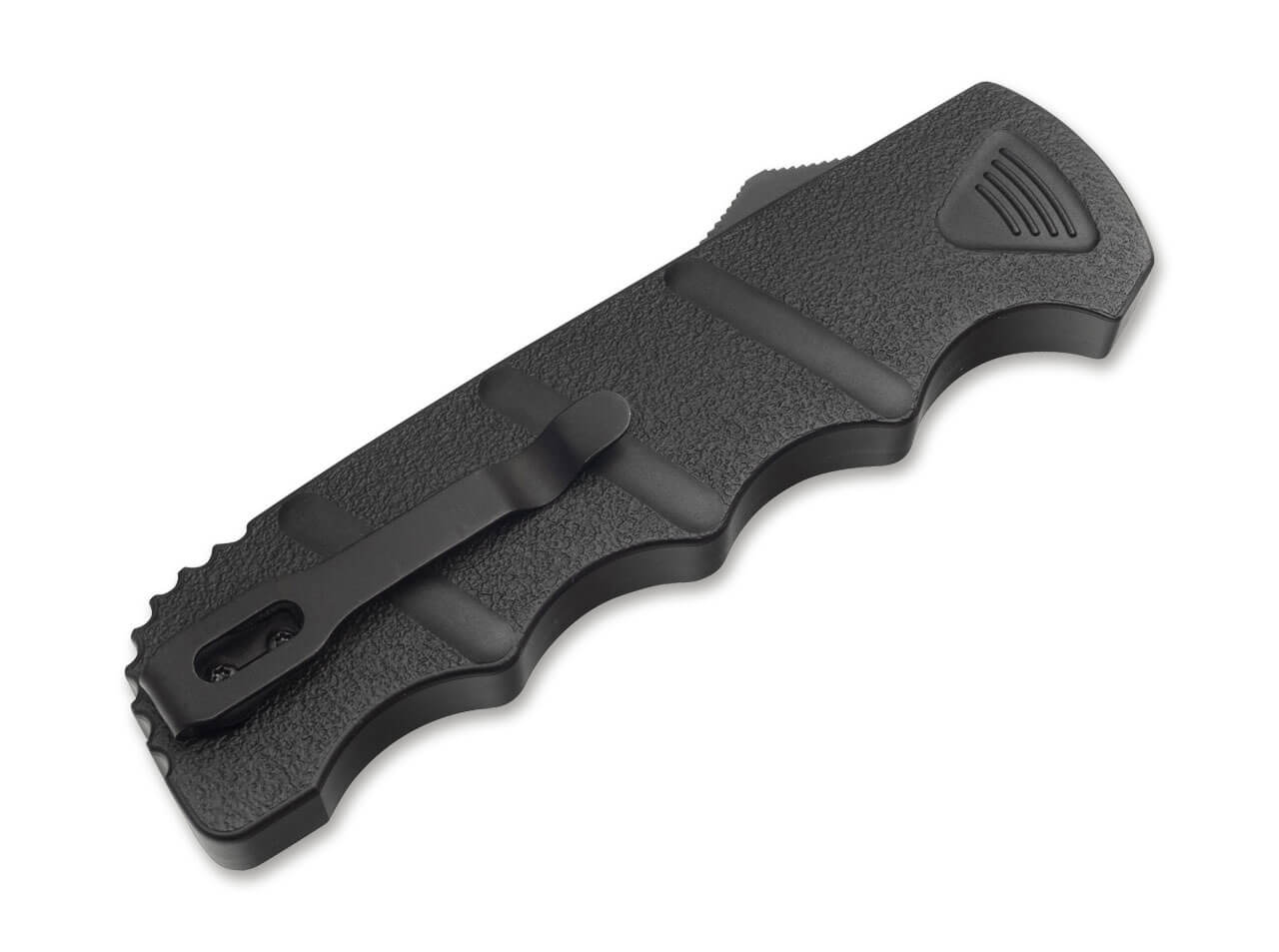 The sturdy Boker Plus Kalashnikov OTF expands the popular Kalashnikov series with a modern OTF. The black aluminium handle is strongly reminiscent of the bayonet of the famous assault rifle, the raised structural grooves also provide a secure grip in any situation. The dark stonewash blade is made of D2 stainless steel and can be conveniently operated via a slide on the back of the handle. Features a practical deep-carry clip (tip-down).