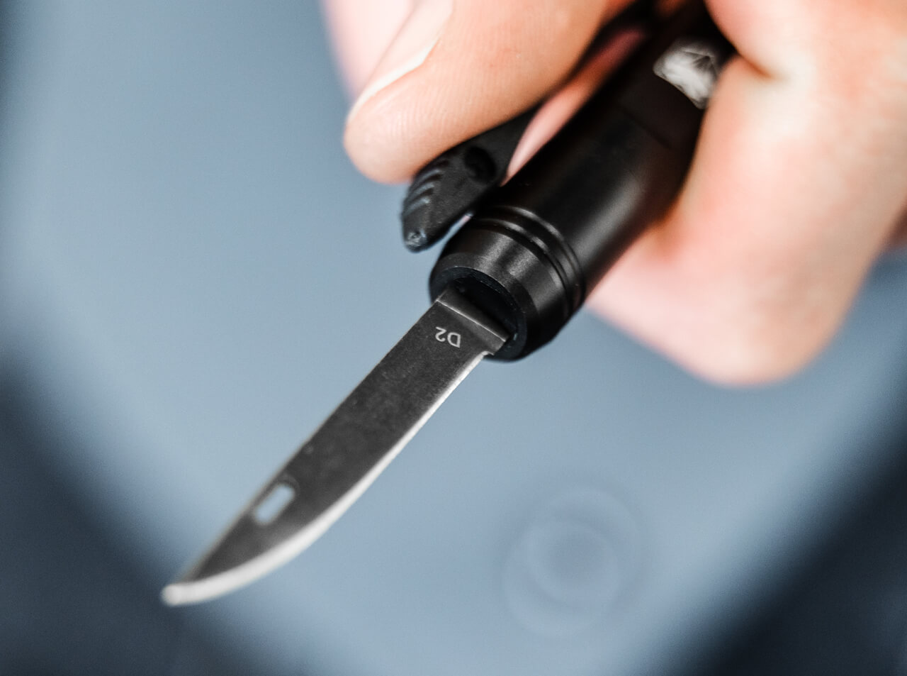 In addition to the ballpoint refill, the high-quality Tactical Pen made of aluminum accommodates an four centimeters long D2 blade in the back of the handle. Thus, small cutting tasks such as opening a package can be done in no time. The blade is operated via the clip.