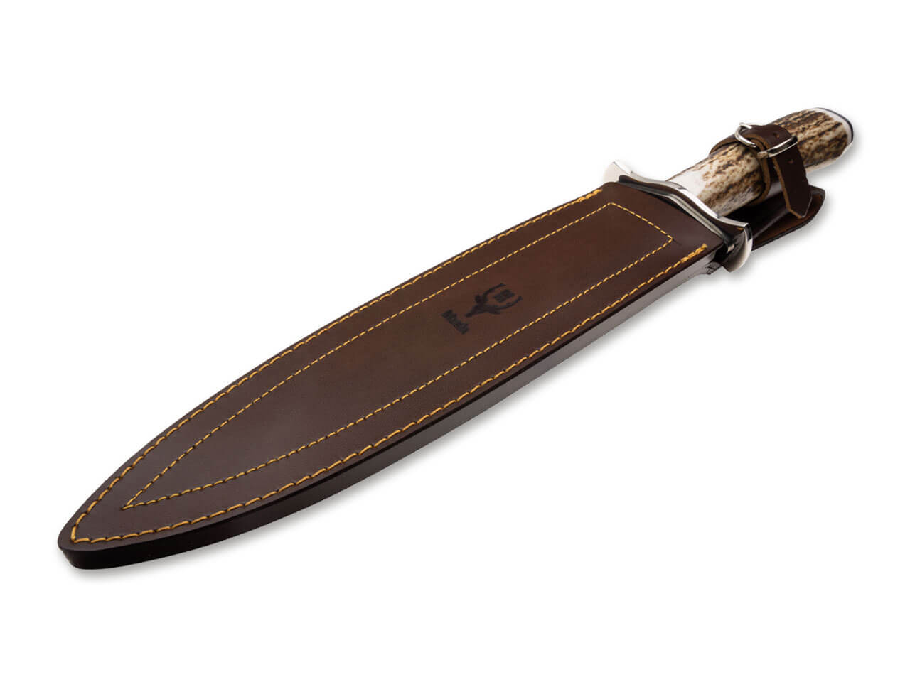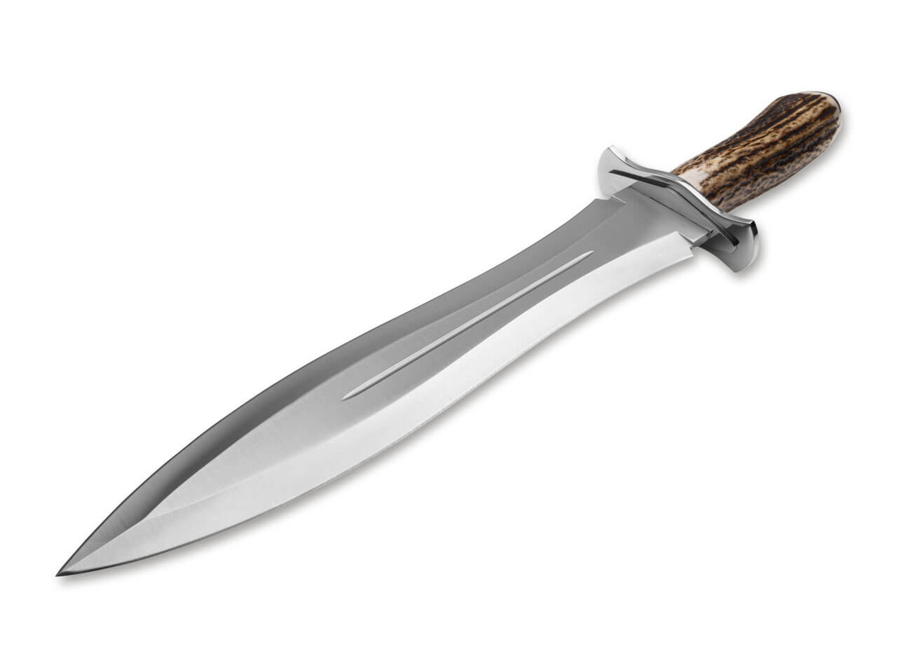 The double-edged blade made from 4116 stainless steel delivers durability, corrosion resistance, and reliable cutting performance. A stainless steel crossguard enhances safety, while the handle crafted from high-quality stag gives the knife a refined, classic character.