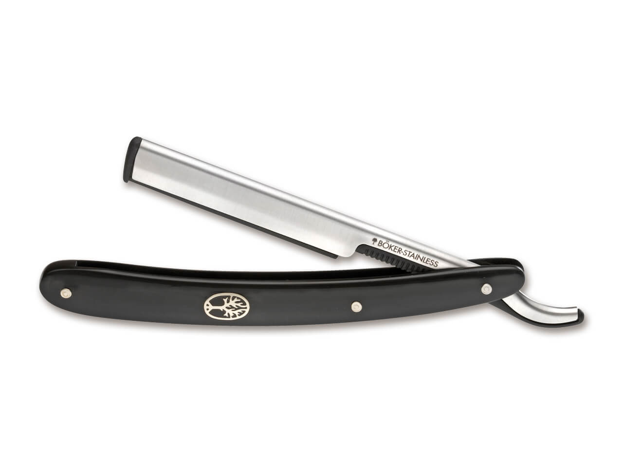 The handles of the Straight Razor knife follow that of forged Straight Razors made by the Boker Manufactory and leave nothing to be desired. You have the choice between moisture-resistant synthetic with nickel silver-inlay, hand-picked olive wood with contrasting grain and elaborate ornamentation, or real stag with decorative stud. The Boker Razette combines professional practicality with the usual handling and balance and authentic aesthetics of a classic Straight Razor. In addition, it provides a price alternative to forged Straight Razors for beginners. Delivered in historic packaging with double-edged razor.