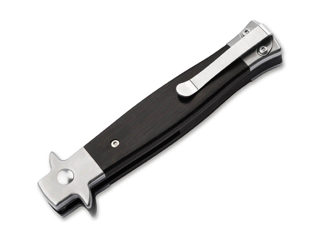 The square-profile handle made from ebony wood combines stainless steel bolsters, a protective guard element, and screwed handle scales to deliver both striking aesthetics and confident ergonomics. Spring-assisted opening via push button provides fast, dynamic deployment, while the Button Lock ensures secure lockup.