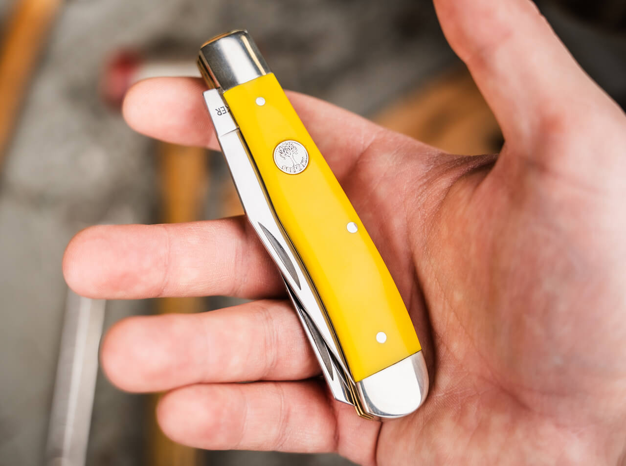 The vibrant yellow Delrin handle, framed by nickel silver bolsters and accented with three rivets, blends durability with vintage charm - a true nod to tradition and craftsmanship.