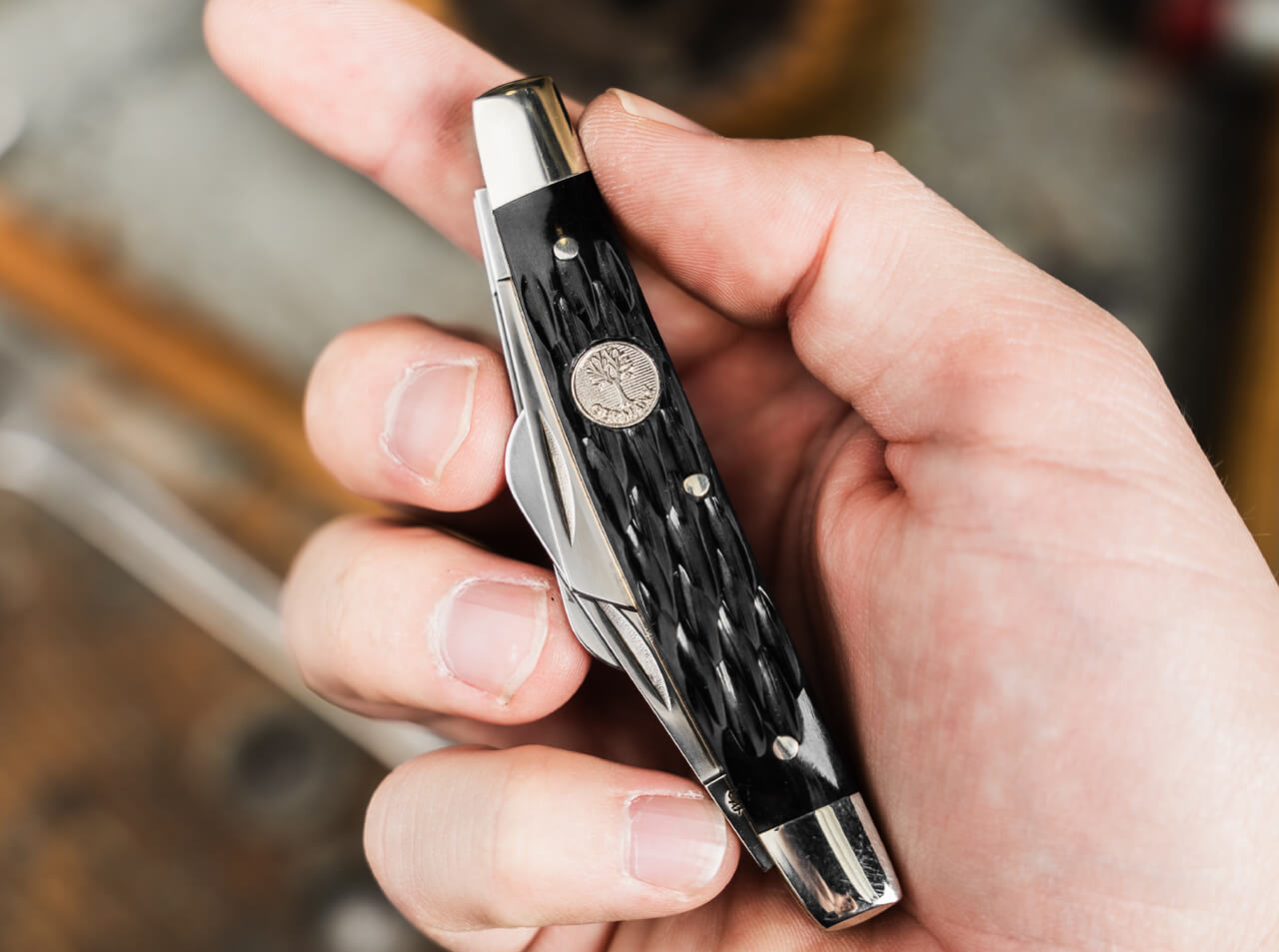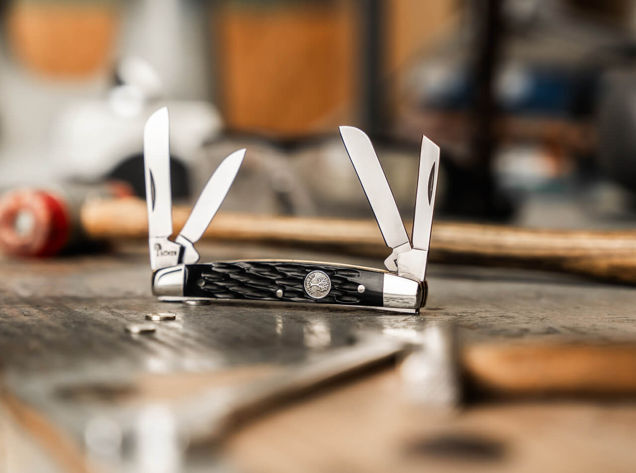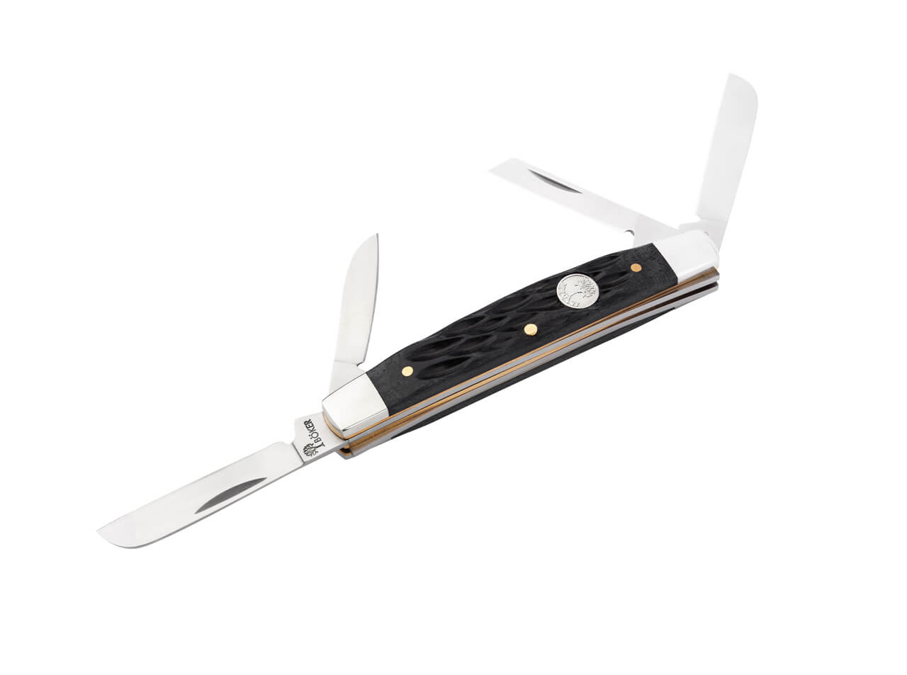 Built around a slip-joint mechanism and classic nail nick opening, each blade locks confidently into place with reliable spring tension. The textured black bone handle, accented by silver bolsters and brass studs, gives this knife a distinguished, heritage-inspired aesthetic.