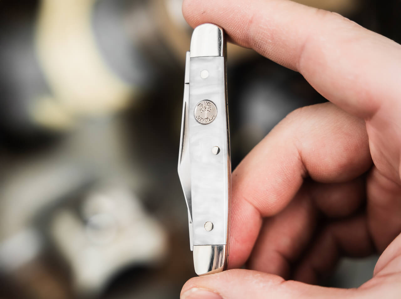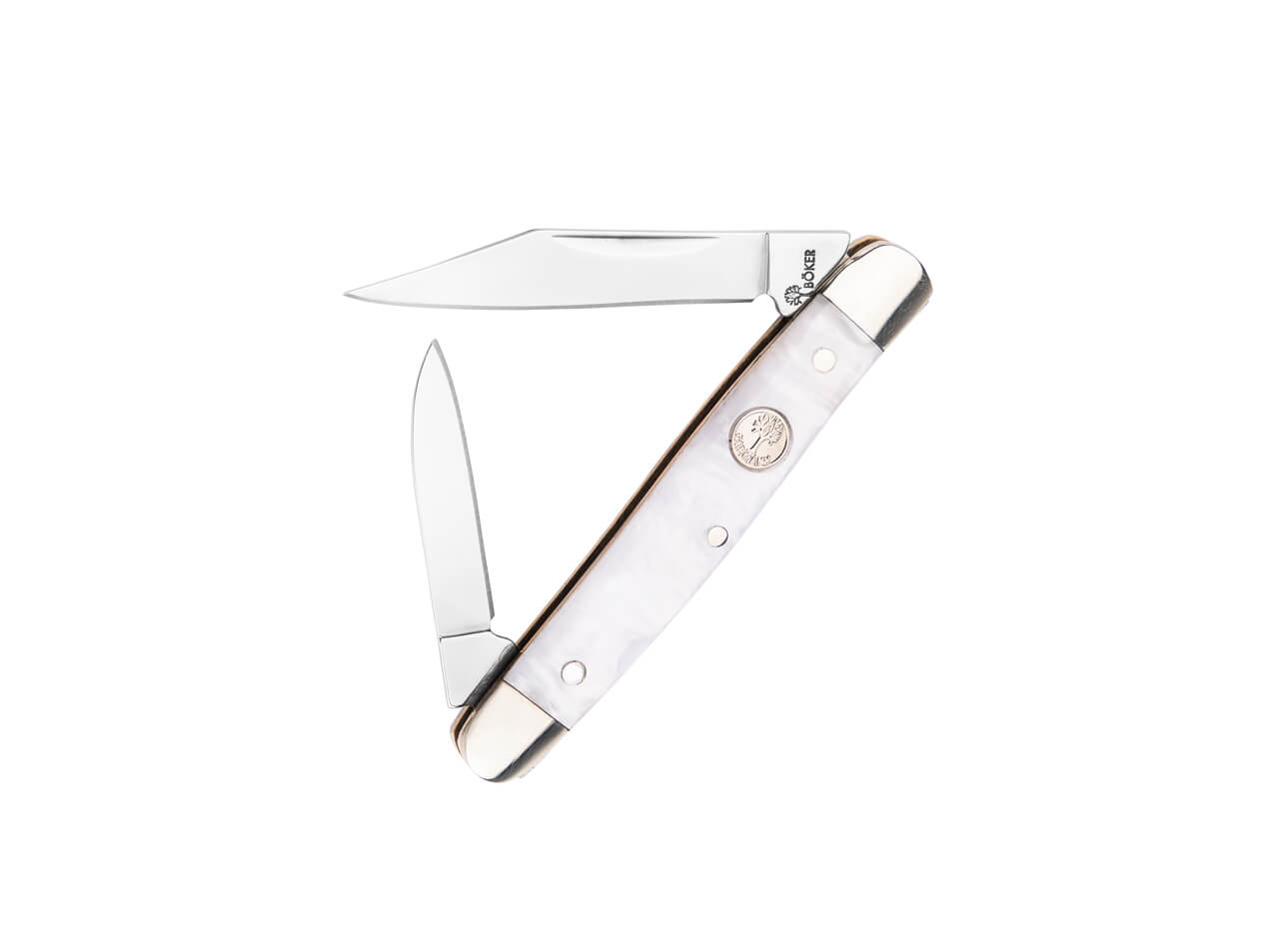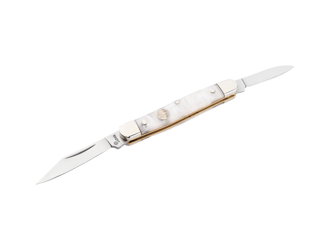 The mother-of-pearl imitation handle, framed by nickel silver bolsters and accented with three rivets, adds a refined touch of vintage sophistication.