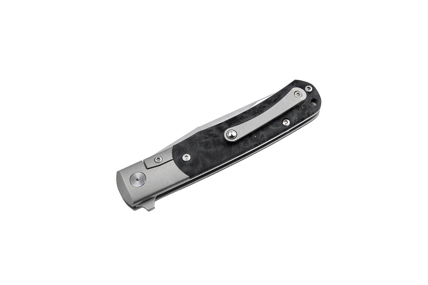 The long bolster of the titanium handle reinterprets the nostalgic spirit of the times and shapes the TRPPR with its handle scales made of stabilised black Amboina wood with its unique grain into a new model of contemporary knife culture. Decorative accents are set by the front blade axle screw, which features the famous Boker tree mark, and the titanium clip (tip-up/r) milled from the solid with a ball. To protect it from dirt and scratches, the Boker TRPPR comes in a high-quality felt pouch. Handmade in the Boker Manufactory in Solingen.